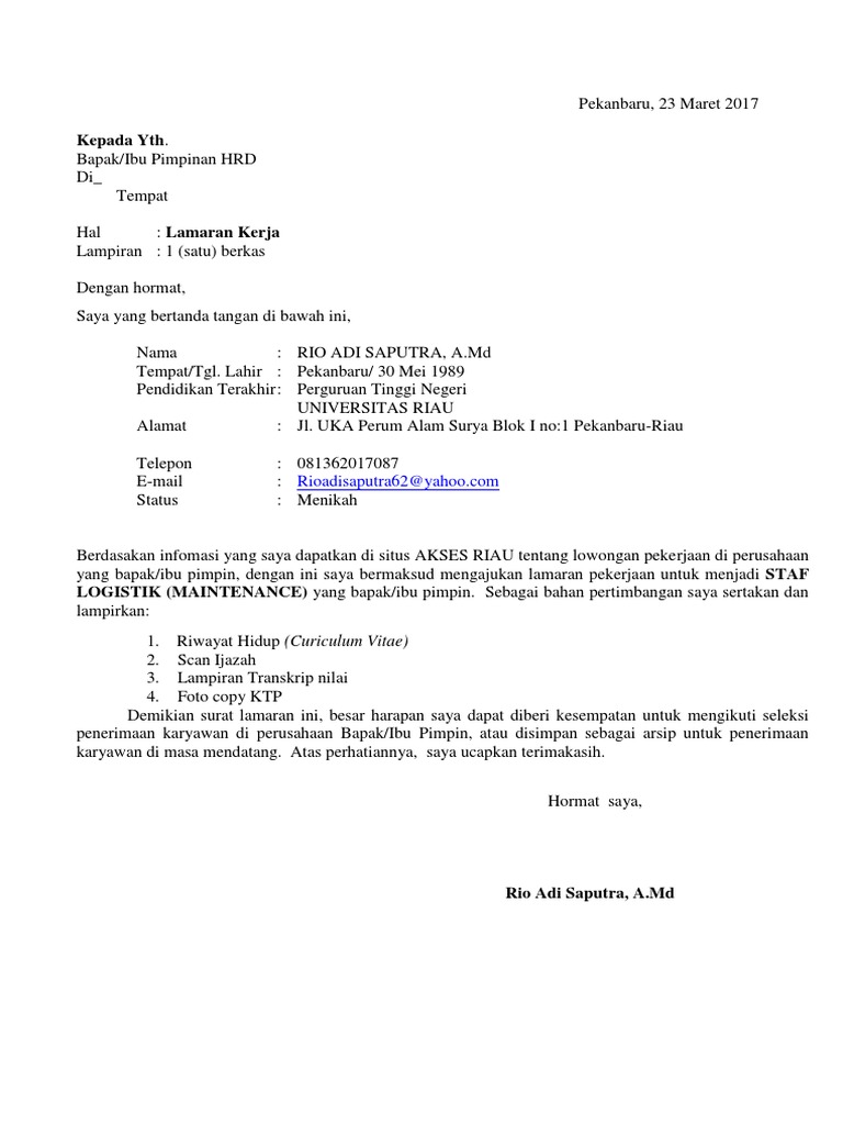 Contoh surat lamaran kerja di pt sebagai karyawan lulusan.